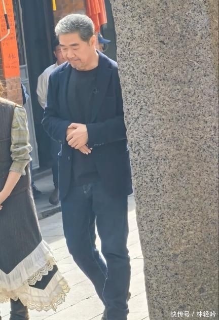 27. 照片中的他站在古城青石板路上,背部微微弯曲,行走时需略微前倾借力,早已不见当年扮演康熙时那种昂首挺胸、气宇轩昂的姿态。